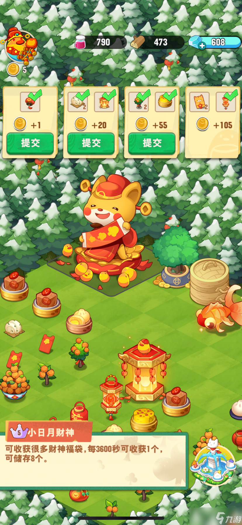 2、图中一共有四类物品产出,产出物品的材料如图2-5所示,分别是灯笼鱼、蒸笼、摇钱树、小日月财神,每点亮一个会对应开启一个任务栏位,越往后的任务栏位给的奖励积分更高,所需要的任务物品等级也会高一些,任务物品和积分会浮动,目前没有测验每个物品给多少积分。全部领取完后除了灯笼鱼是100分钟又储存满,其他三个都是8小时存满,可以根据需要定时收取。