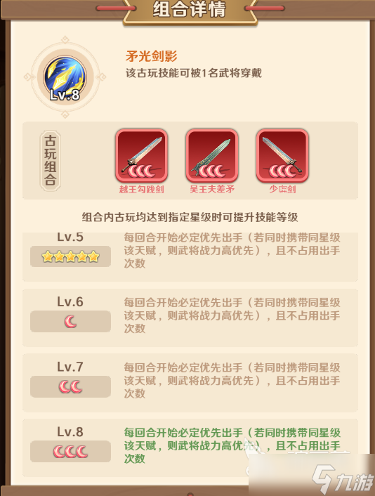 第一套组合需要收集越王勾践剑、吴王夫差矛还有少虡剑这三件古玩才能激活。激活之后的效果就是每个回合开始的时候,佩戴这套古玩的武将可以必定先出手,而且不会占用正常的出手次数。如果双方都有武将佩戴了同样星级的这套古玩,那就看谁的战力高,战力高的先动。这个效果听起来好像没什么,但是放在实战里面作用就大了。比如说队伍里面有那种专门给队友加怒气的辅助武将,让他先手出招的话,主力输出武将就能更快放大招。或者是有些武将的技能可以给对面挂减益效果,甚至是直接控制对面武将,让这种武将抢到先手就能打对面一个措手不及。特别是在打那些势均力敌的对手时候,谁先手谁就占优势,很多时候一个先手就能决定整场战斗的走向。所以这套古玩组合建议优先给队伍里面的控制型武将或者辅助型武将佩戴。