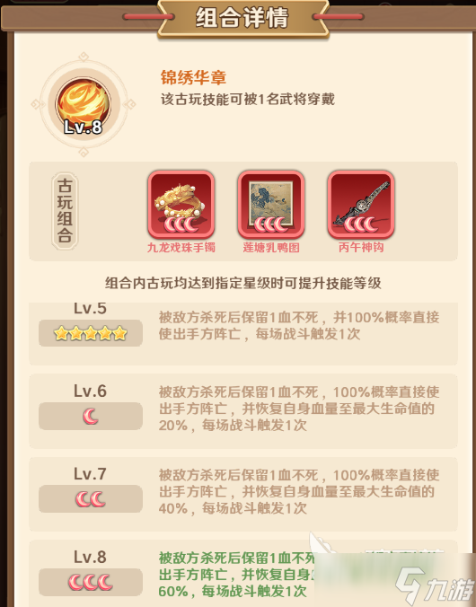 第三套组合需要九龙戏珠手镯、莲塘乳鸭图和丙午神钩三件古玩。激活之后的效果非常霸道,就是当武将被敌方1打死的时候不会真的死,会保留1点血,然后直接反杀对面那个出60%手的武将,并且自己还能恢复到60%的血量。每场战斗这个效果能触发一次。这个效果可以说是保命加反杀二合一了,特别适合给那些输出很高但是比较脆的武将佩戴。让这些武将佩戴之后就不用太担心被集火秒杀,反而还能利用这个机会反杀对面的关键武将。建议给队伍里面的第二或者第三输出武将佩戴,因为主力输出一般会受到重点保护,反而是这些副输出容易成为对面的目标。